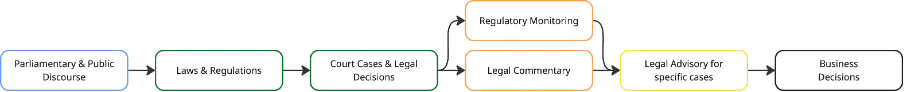 The chart below shows how legal information evolves from political discourse into legislation and case law, which is interpreted by experts and ultimately translated into legal advice that informs business decisions.