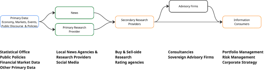 The primary data is then used by secondary research providers based in the financial centres of the world who mainly act as another filter and standardization layer to make analysis comparable across countries. The output is then provided to the ultimate consumers of the information who need to make decisions such as building a new factory in a different country, allocating resources based on expected demand, making supply chains more resilient, or managing portfolios and conducting proper risk management. In many cases there are consultancies and advisory firms involved that translate the information into the context of a specific organisation or project.